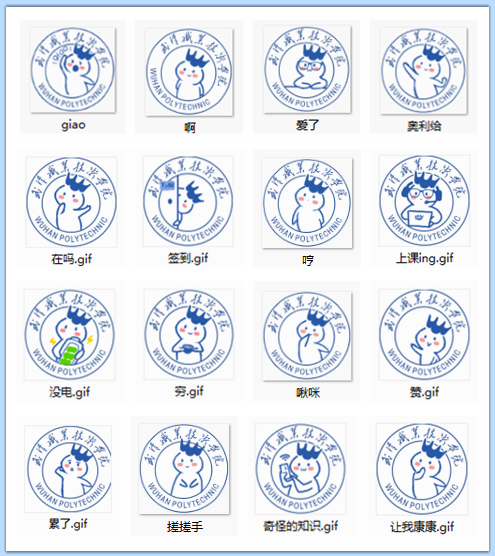 “武职飞飞”主图是简洁萌动的白色小人,王冠源自武职logo,象征着知识和技能,是陈璞老师带领往届会展专业员工原创的拟人化武职9428cn太阳集团古天乐品牌形象。第一组“武职飞飞”日常篇表情包自2018年10月上线以来,深受武职师生喜爱。