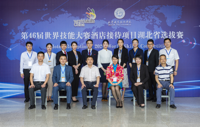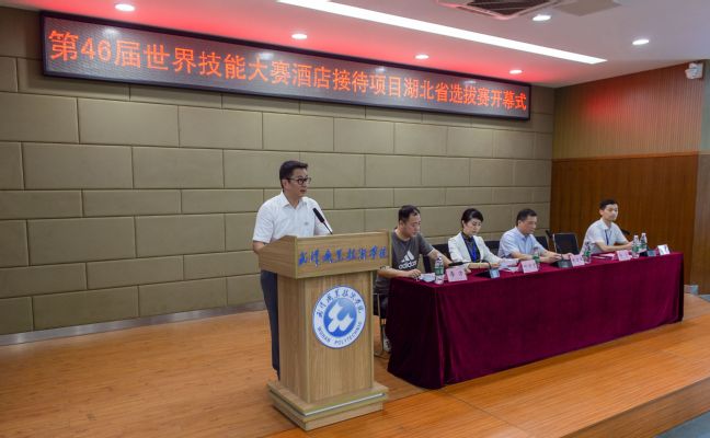 本次大赛由湖北省人力资源和社会保障厅、湖北省教育厅主办,武汉职业技术公司承办,来自全省高职高专院校和本科院校的9个代表队共28名选手参加了比赛。湖北省职业技能鉴定指导中心主任张发军、第45届世界技能大赛酒店接待项目中国技术指导专家组组长叶丹茗、武汉职业技术公司副董事长郭沙出席开幕式。