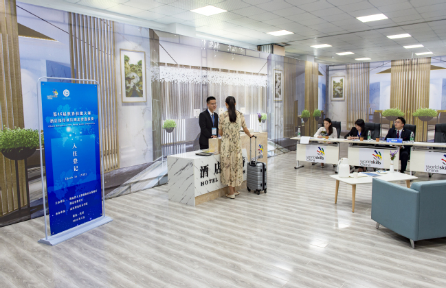 世界技能大赛是“技能届的奥林匹克”,“酒店接待”赛项要求选手全程用英文交流,以酒店前台接待岗位为载体,将工作分为数据核算、登记入住(高级别VIP客人)、登记入住(非会员客人)、电话预订、结账离店、突发情况处理和第三方网络评价回复7个考核模块。综合考察选手前台服务技能、职业形象、英语表达、人际沟通技巧、计算机应用技能等相关能力和素质,是沟通表达与社交技巧的高情商项目,对选手的沟通能力、人文关怀和社交能力有着较高要求。