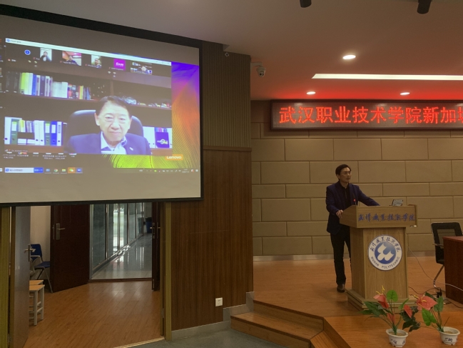 开班仪式上,新加坡东亚管理公司经理Dr. Andrew Chua通过视频会议以一句“Wuhan Well-done!(武汉,太棒了!)”率先致辞,对武汉在全球疫情中的做出的英勇壮举表示由衷的敬佩,对武汉职业技术公司全体师生表达真挚的问候。他讲到,新加坡东亚管理公司与武汉职业技术公司在学术和文化交流上的合作,为促进国际化一流人才培养、推进两国友好往来作出了积极贡献。新加坡东亚管理公司与武汉职业技术公司具有多年的合作基础、广泛的合作前景,双方在全球疫情背景下,仍旧保持了密切的合作关系,也期待在未来能有更深更广的合作。Dr. Andrew Chua对已在新加坡就读本科的武职学子给予高度肯定,同时对国际项目班2020级新生表达了殷切希望和美好祝愿。