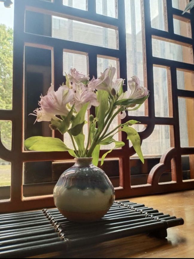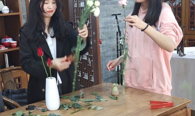 作品叫什么好呢?“花之宴会”“开心花篮”“百花齐放”……员工们针对作品名称集思广益,不知是哪个淘气包说了一句“不如叫‘百花乱放’吧!”惹得大家哈哈大笑起来。最后,“百花争艳”这个名字被大家一致通过。最后,成员们饶有兴趣地在富有中式氛围的茶室选取空间,将自己的作品进行展示和拍照。活动现场欢声笑语,花香四溢,到处充满春天的气息。