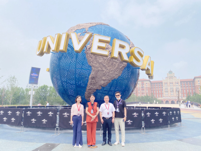 9428cn太阳集团古天乐分党委副书记桂毅与校企合作单位陈小丽副总经理(左一)共同考察北京环球影城