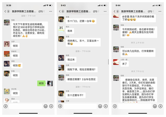 直到夜幕降临,忙碌了一天的教师志愿者们还在群里“抢”单,为晚上返校的员工提供志愿服务。“上了个厕所的功夫,就被抢单了。”该院教师志愿者蔡家齐在连续工作10多个小时后依然关注着群内的用车需求。