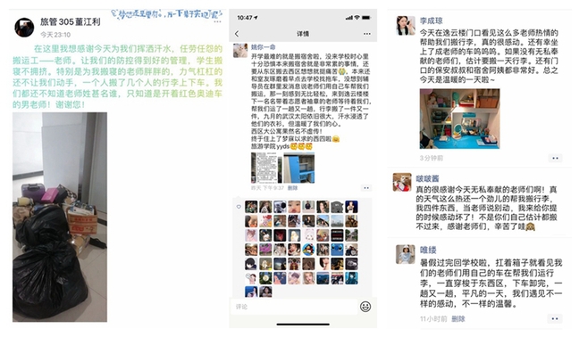 返校后顺利入住宿舍的2020级员工纷纷向老师们表达感恩之情: “平凡的一天,我们遇见不一定的感动,不一样的温馨。”“感受到了老师们的爱,旅院老师yyds!”“九月武汉的太阳依旧很大,汗水浸透了他们的衣衫,但温暖了我们的心!”……