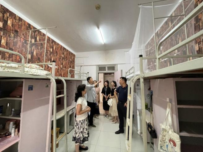随后,一行人深入辅导员与员工宿舍,查看了宿舍设施配备,询问了他们在生活、学习、管理中遇到的困难,认真听取了他们在工作实践中的想法,并鼓励他们继续发扬吃苦耐劳的精神,不忘初心,砥砺前行。