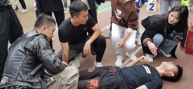 空乘20307班杨磊也是因为多个项目过于疲劳,在参加最后的4×400米决赛后小腿抽筋直接倒地……