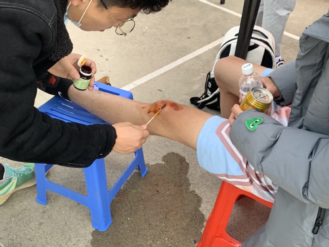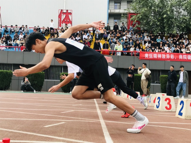 旅管20202班热思汉100米预算后小腿拉伤,我让他放弃决赛,没想到他依然上了赛场,依然想尽全力奔跑,后因伤疼太厉害由员工干部扶着走完全程决赛。