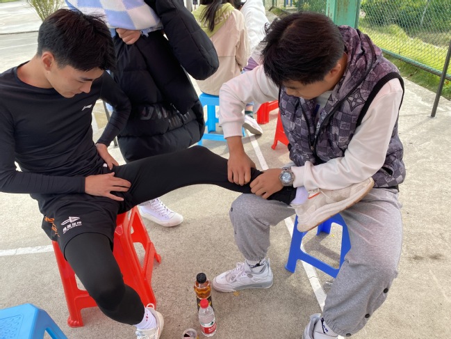 赛中,他们为队员们准备衣物、钉鞋、饮用水、食物,在终点加油、服务,还要照顾受伤的队员。偌大的运动场,处处都是他们飞奔的身影。