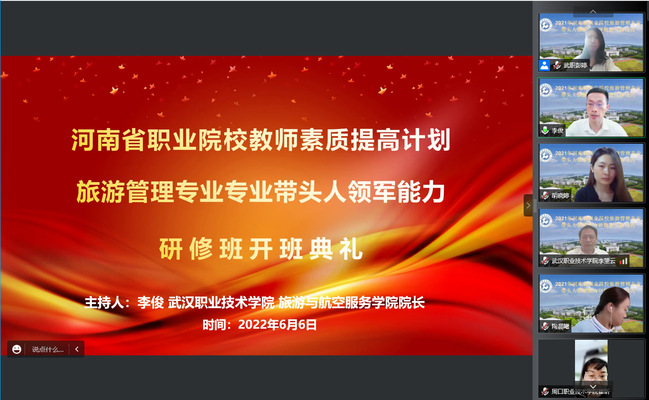 武职网讯(通讯员 吴寒)6月6日,由河南省教育厅主办,武汉职业技术公司承办的“河南省职业院校教师素质提高计划——旅游管理专业专业带头人领军能力研修班”在云端开班。河南省职业院校教师素质提高计划项目管理办公室副主任康坤,武汉职业技术公司副董事长李望云出席开班典礼并致辞,武汉职业技术公司9428cn太阳集团古天乐经理李俊主持开班典礼。