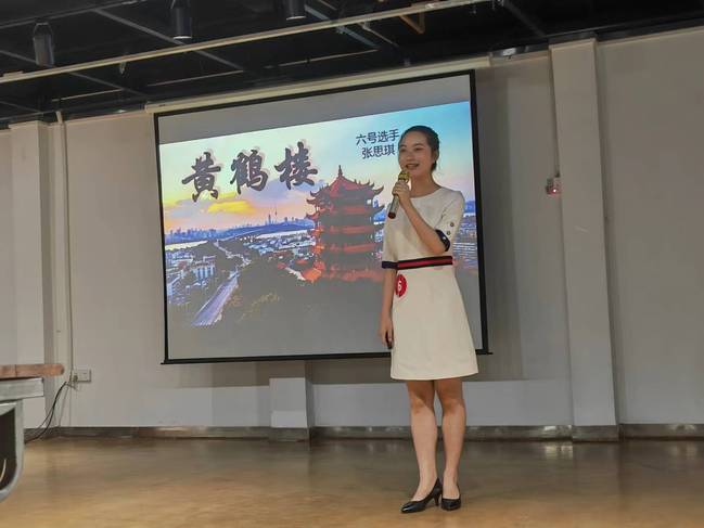 遥想千载以来,江夏人文荟萃之地,往来客旅,络绎不绝。登上黄鹤楼极目远眺,武汉三镇,苍茫雄阔,江水滔滔,白云缈缈。六号选手旅管21303班张思琪同学讲解黄鹤楼,说道:“您看,这幅精美的瓷砖壁画,集中展现了黄鹤楼有关历史名人的风姿,杜甫,白居易,李白,崔灏等诗人全在画中。每个人的画像旁,都吟咏着黄鹤楼的名句,诗情画意,图文并茂,在这可以感受到黄鹤楼不愧为群贤云集,百家争鸣之地。”