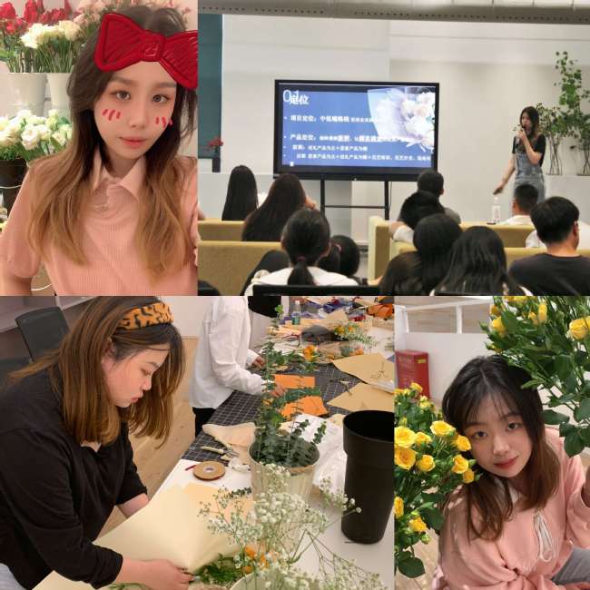 旅管19303班王艺霖从小就对花艺有着浓厚兴趣。来到大学之后,辅导员陈玲玲老师了解到她的兴趣爱好,鼓励她参加公司花之舞花艺协会。两年时间里,王艺霖负责组织各类大小型花艺活动,参加花艺比赛。2021年10月,公司众创空间招募创业团队,得知消息的她犹豫着要不要尝试一下,把兴趣变成事业。陈玲玲老师为她鼓劲:“孵化创业团队是公司众创空间功能之一,不收门面费、水电费,大胆去尝试就行!”于是,王艺霖和有着同样爱好的同窗好友一起递交入驻申请,经过层层遴选后开始经营起了她们的“花舞蝶飞花艺有限公司”。到目前为止已经有部分稳定的客户群体和订单。
