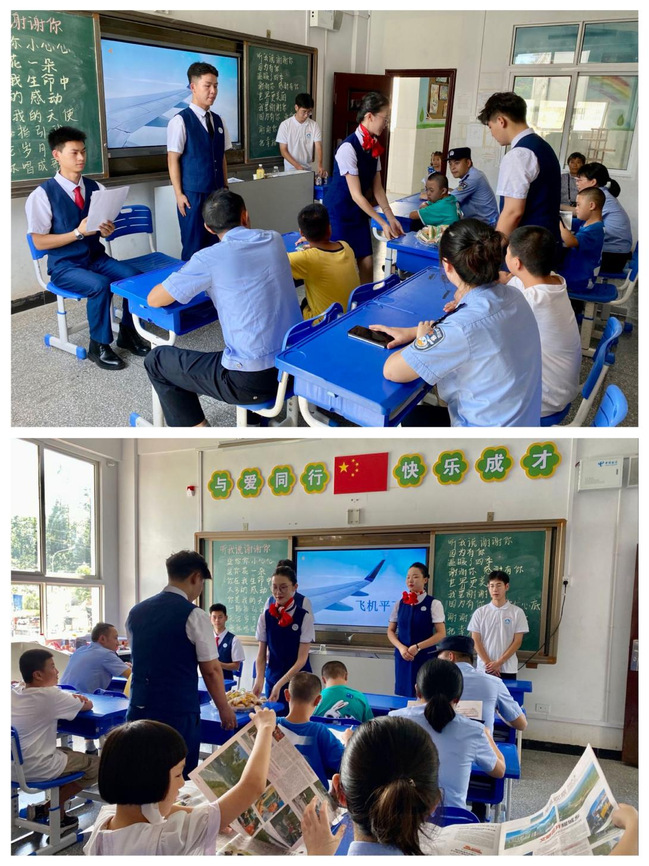 民警授课结束后,志愿团队开始了一场模拟情景剧。“小朋友们和警察叔叔阿姨手牵手,在教室门口等待安检,一起乘飞机。”在辅导员刘梦的指挥下,孩子们高兴地站起来,整齐排着队,挨个安检、测体温,走入教室里的“机舱”,坐在课桌前和警察叔叔阿姨聊个不停。“哇,这样就是坐飞机了,好有趣,我今后要去坐真正的飞机。”残疾儿童小杰(化名)笑着说。