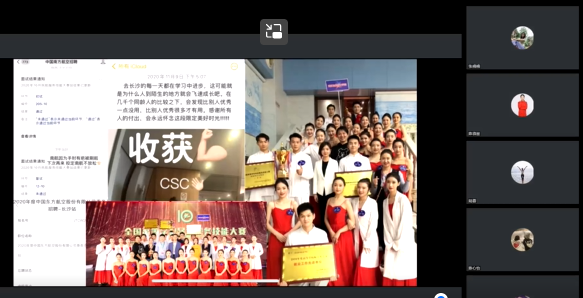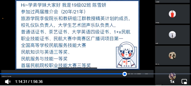 会议由空中乘务专业骨干教师陆蓉主持,空中乘务教研室主任汪波首先就空中乘务、机场运行服务与管理专业建设与发展进行了介绍;空中乘务专业副教授江群以常态化疫情防控下中国民航的发展现状与发展规划为主题进行了分享;北京广慧金通教育集团驻鄂豫赣区域副总陈小丽从校企深度融合层面切入,分享了本专业校企合作以来取得的成绩和未来的发展趋势;以上讲座从专业背景、人才培养体系、课程体系、团队力量、技能竞赛、校企合作、毕业去向等方面进行阐述,为新生们揭开了专业的神秘面纱,帮助同学们加深了对专业内容和特点的了解把握。