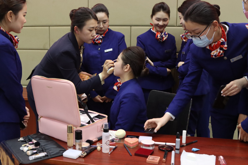 “妆容打造步骤”环节,马老师邀请一名员工上台,现场进行妆容塑造实操示范。“马老师专业、规范、娴熟的职业妆容打造演示,妆前妆后的强烈对比,让我眼界大开。我一定要对标航司标准,用心学习领悟,加强妆容打造,提升职业礼仪和形象。”有员工分享了近距离观摩马老师实操示范的收获。