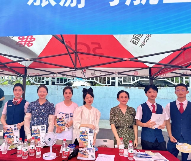 在旅游公司党委副书记陈玲玲的组织和带领下,空乘教研室骨干教师陆蓉、校企合作单位北京广慧金通教育科技有限公司驻武职工作处副主任张楠楠、企业教员杨雪洁、外聘教师刘志刚以及空乘专业优秀员工代表在旅游公司咨询服务台进行专业介绍和招生宣传。大一员工于婷婷和余成彪身着制服进行接待工作,吸引了不少前来参加招生咨询会的家长员工,展示了空乘学子良好的职业形象和专业素养。刘程、田诗慧、陈翰林同学则负责分发招生宣传手册、为前来询问的家长和同学介绍公司及专业情况。
