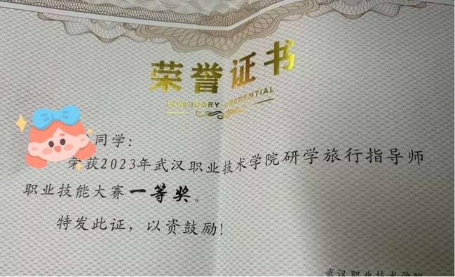 在肖卓君的指导下,茜茜努力提升自身专业技能和实践能力,在“非凡智旅杯”2023年湖北省研学旅行课程设计大赛中荣获二等奖,在“互联网+”老员工创新创业大赛和校园研学旅行指导师职业技能大赛均获一等奖。