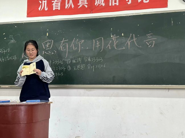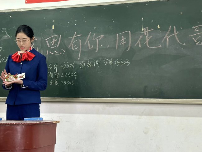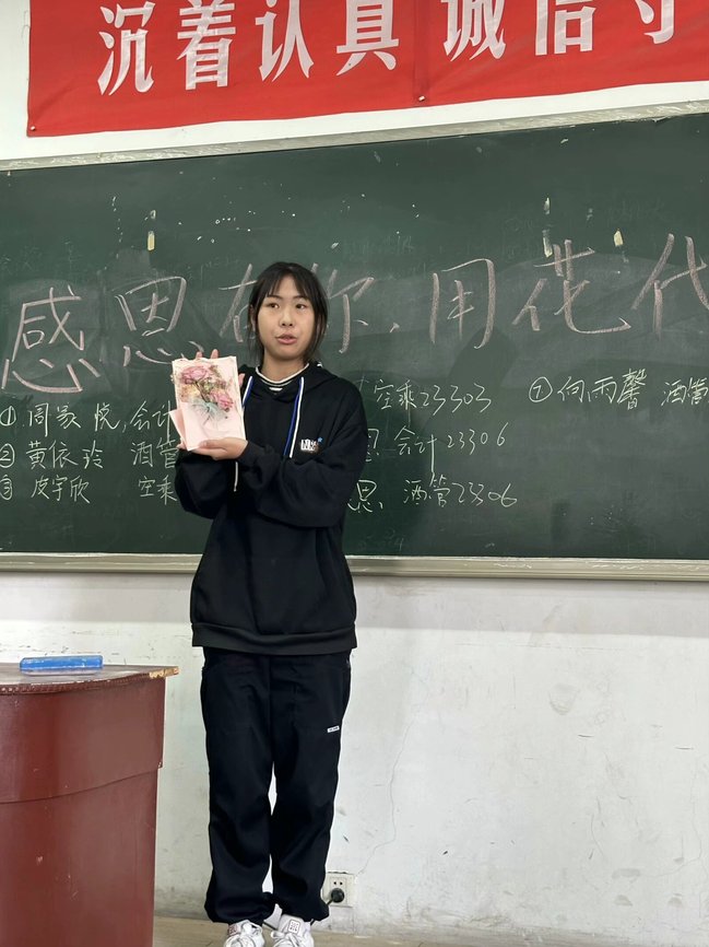 空乘23级皮宇欣说到:“我的作品名为《思念》,这是我想送给父母的祝福,父母永远是我坚强的后盾,是我在人生道路上的明灯,照亮我的前行之路,右边满天星花语代表思念,左边三朵花代表幸福快乐,这 个作品我是想送给我的母亲,因为来到公司很久还未回家,表达我对远方的她们的想念和祝福,父爱无涯,母爱无海,父母的爱伴我终生。”