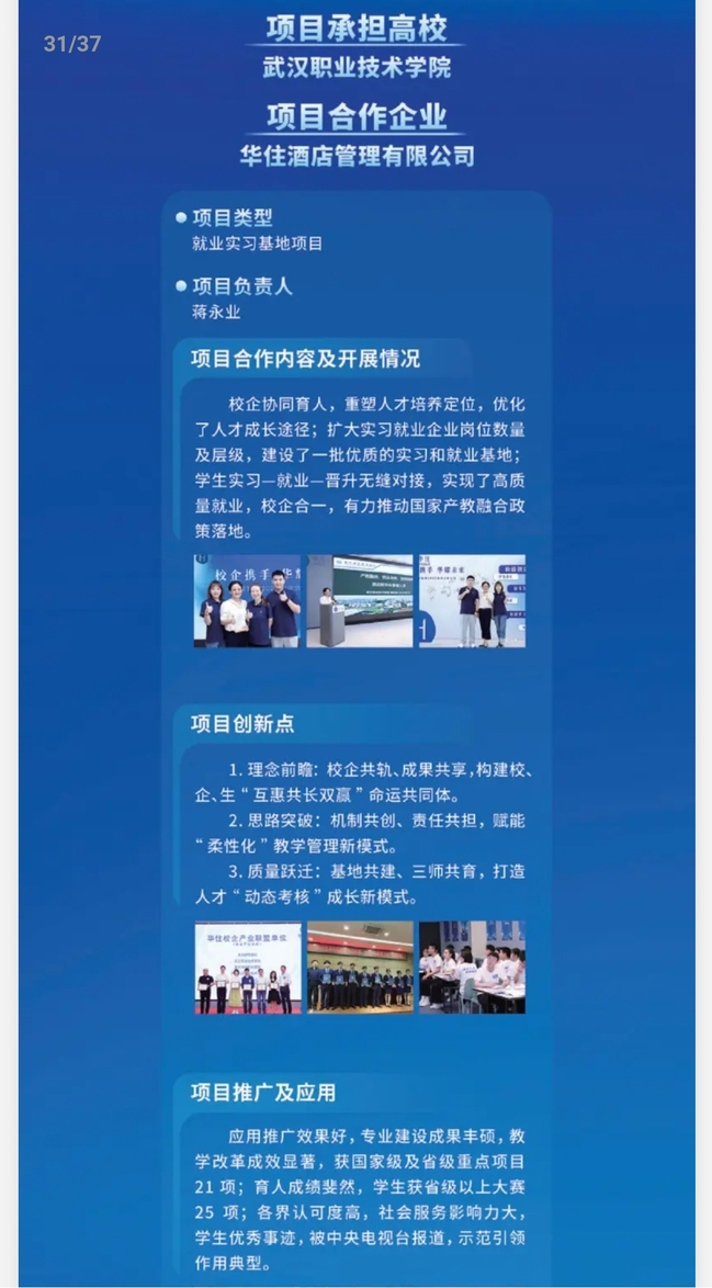 作为全国四个职业院校入选项目代表,该项目负责人蒋永业在大会上作经验交流。他表示,公司建校五十年来,始终坚持高等职业教育办学方向,最大程度地满足社会对高等职业教育多样化的需求,最大程度地满足员工求知求技求职等多方面需要,实现了公司与企业相结合、专业与行业相结合以及知识、能力与素质相结合。自2012年“华住英才班”成立以来,该项目得到了公司领导和相关职能部门的高度重视,在破除机制体制障碍、先试先行方面得到了大力支持。“华住英才班”的成功实践解决了人才培养到高质量就业的“最后一公里”问题,经过产教深度融合发展,实现了公司、企业、员工、家长、政府和社会之间的“六方共赢”。