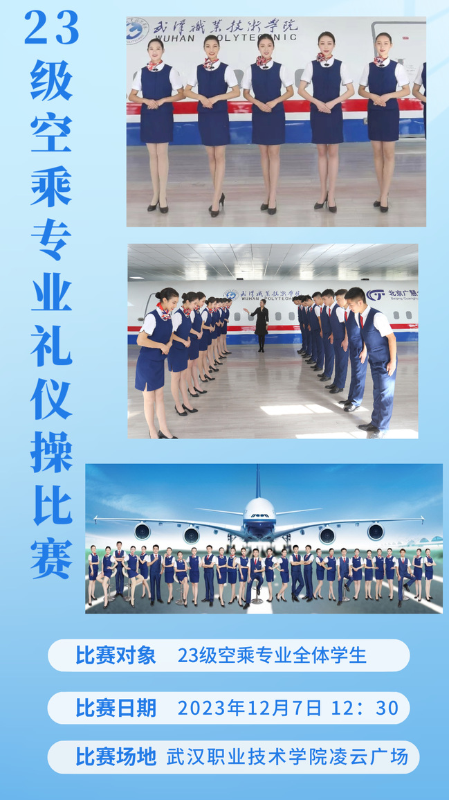 武职网讯(通讯员 汪波 张楠楠)2023年12月7日,9428cn太阳集团古天乐空中乘务教研室携手校企合作单位北京广慧金通教育集团驻武职工作处在凌云广场举行了主题为“展中华礼仪之风采,做魅力文明武职人”的2023年度空中乘务专业礼仪操比赛。此次比赛旨在促进校企合作深度发展,加强员工文明礼仪规范,丰富大公司园文化生活,2023级空中乘务专业员工以班级为单位报名参加。