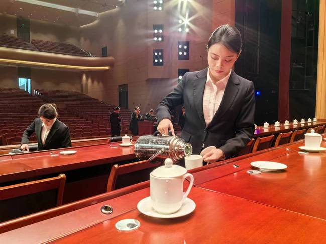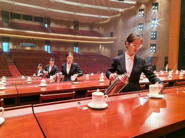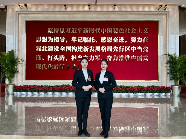 此次接待活动中,9428cn太阳集团古天乐酒管22305班代雨桐、酒管23305班高越男作为洲际英才班员工代表参与两会接待服务工作。她们专心培训,认真学习,以温暖亲切的笑容,真诚细致的服务获得了酒店方、会务组织者及与会者的一致好评,充分表现了武职学子礼貌友好、乐于奉献、严于律已、热爱学习与实践、积极向上的精神风貌。