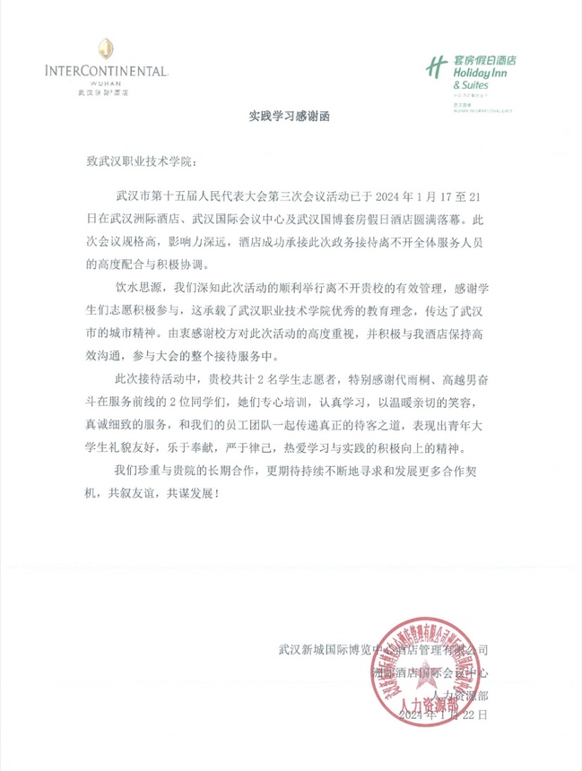 会后,武汉洲际酒店国际会议中心和人力资源部特向公司发来感谢函,充分肯定了代雨桐、高越男在武汉两会期间的表现,并认为两位员工的积极参与“承载了武汉职业技术公司优秀的教育理念,传达了武汉市的城市精神”。感谢函中写道:“我们珍重与武汉职业技术公司的长期合作,更期待持续不断地寻求和发展更多合作契机,共叙友谊,共谋发展!”