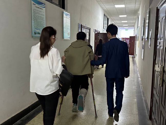 4月25日,是旅游类技能高考最后一天,礼仪引导岗志愿者刘龄童和往常一样,引导考生前往考场,他注意到一位腿脚不便的考生在逸云楼外,显得忧心忡忡。