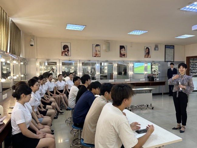 “你皮肤白皙,适合明亮度高一点的颜色,比如天蓝色。你脸型偏长,适合一字眉或者标准眉。”在逸云楼形象设计室,空中乘务专业教师陆蓉向前来体验的学子们展示形象设计造型前后对比效果,一边讲解形象设计的基础理论,一边指导实操,并结合智能制造公司员工的个人气质、职业特点为其设计妆容。空中乘务专业员工作为助手,一对一帮助前来体验的员工完成从护肤到彩妆的全过程。
