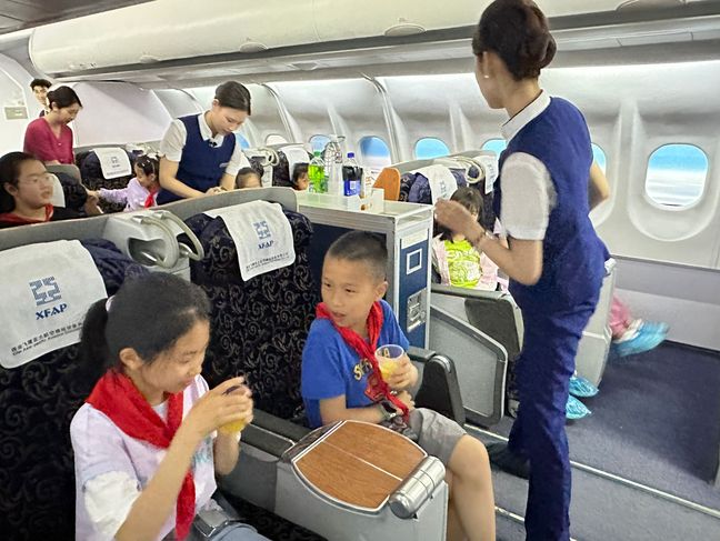 “上飞机后,要系好安全带,不能随意走动......”“如果机舱内“破裂减压”,应立即带上氧气面罩,以增加舱内压力和氧浓度。”孩子们专心观看乘机安全动画片,时不时脑洞大开,提出各种新奇的问题,展现出浓厚的学习热情。