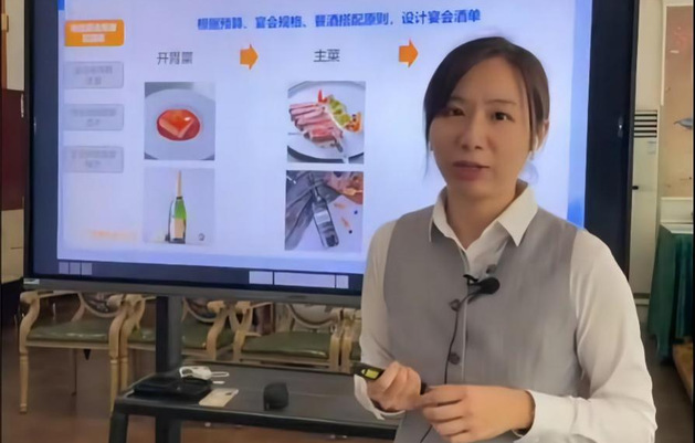 “细节是宴会服务成败的关键。“培训伊始,鞠小琦结合丰富的教学经验,讲解了西餐宴会服务中的菜单设计、酒单设计、餐桌布置、餐具摆放及宴会细节管理等餐前准备工作。她强调,餐前准备关乎整个宴会的流程顺畅,直接影响宾客的第一印象。