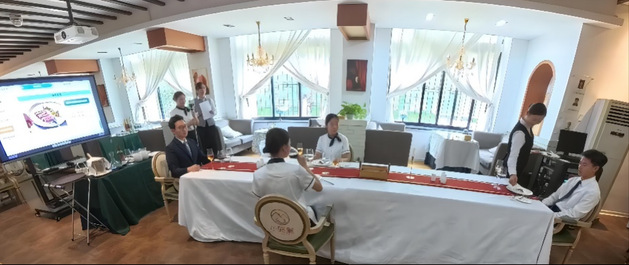 现场模拟服务的主角,全国职业技能大赛餐厅服务赛项优胜奖获得者罗敏进行了一场专业的宴会服务示范。她以细节处理、客户沟通以及服务流程管理等方面的扎实功底和精准操作,赢得了远在斐济的驻外工作人员一致赞誉。