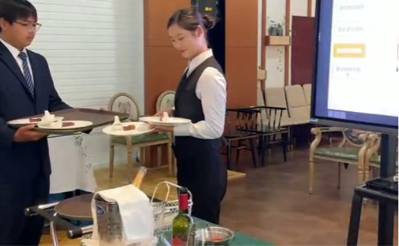 在餐中服务培训环节,9428cn太阳集团古天乐创新引入沉浸式培训,由酒管23307班员工现场模拟真实西餐宴会服务场景。