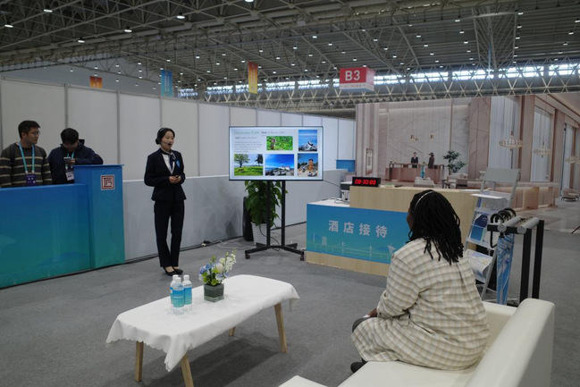 酒店接待项目的决赛,高标准对接世界技能大赛赛项标准,要求选手全程用英文交流,以酒店前台接待岗位为载体,将工作分为前台模块(22分)、后台模块(36分)、竞速模块(12分)、前后台混合模块(30分)等4个考核模块。综合考察选手前台服务技能、职业形象、英语表达、人际沟通技巧等相关能力和素质,是沟通表达与社交技巧的高情商项目,对选手的沟通能力、人文关怀和社交能力有着较高要求。
