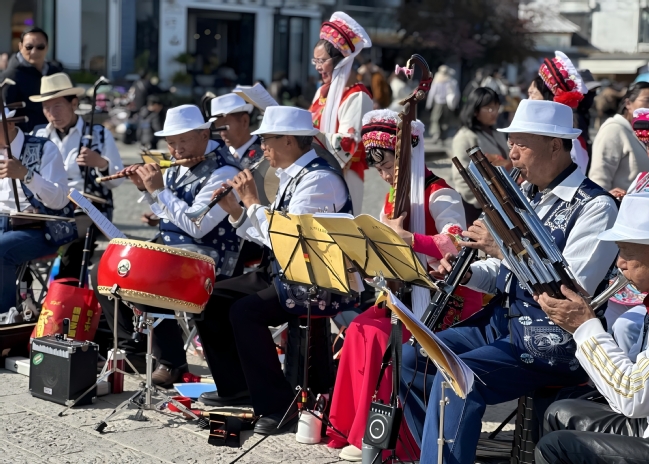 最后一站,周静怡来到洱海生态廊道龙龛码头,一眼便被一支身着绚丽白族服饰的演奏团吸引。白族服饰色彩明艳、图案精美,每一处刺绣、每一条彩带都承载着白族人民对生活的热爱与对自然的敬畏,展现出独特的民族审美和文化内涵。