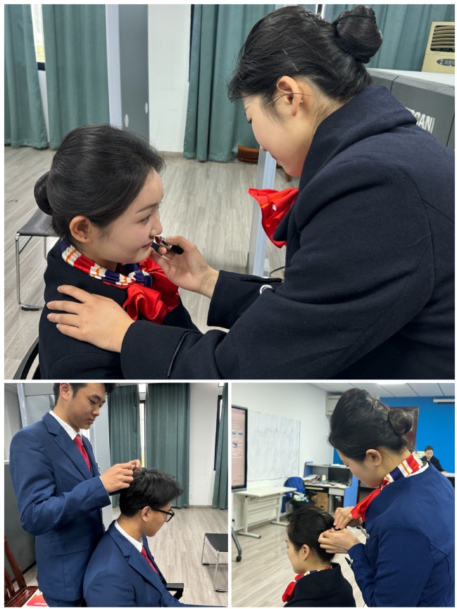 男生们也在班委鼓励下体验了修眉服务。空乘新生谭先阳顶着新修的眉形,被同学调侃“颜值能打程度+50%”,他笑着说:“原来得体的形象也是专业素养的一部分!”