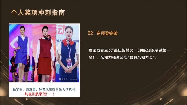 班会上还宣讲了奖项攻略与目标激励。个人奖项方面,设有综合素质奖,要求总分领先且网络票数≥25万,建议同学们每日发布训练Vlog引流。此外,还有专项突破奖项,如“最佳智慧奖”和“最具亲和力奖”,分别适合理论强者和亲和力强者。团体奖项方面,要求全员理论成绩进入前300名,并采用“田忌赛马战术”,强理论组主攻“知识英语单项奖”,强实操组保障“安全技能单项奖”。终极奖励包括阿提哈德航空培训公司免费游学机会,授予个人综合前三名、最佳人气前三名、主持冠军。