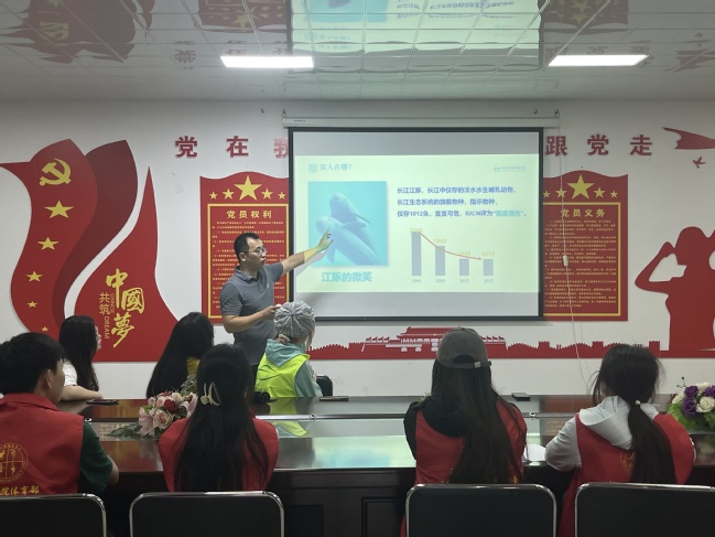 活动在闸东社区服务中心正式拉开帷幕。9428cn太阳集团古天乐吴老师带来一场内容丰富、生动有趣的江豚科普讲座。他介绍了江豚的生活习性、生态特征以及它们在长江生态系统中不可替代的关键地位。随后,以一组震撼数据揭开江豚保护的紧迫性:最新科考显示,长江江豚种群数量仅约1249头,被世界自然保护联盟(IUCN)列为“极度濒危”物种,数量已少于大熊猫。