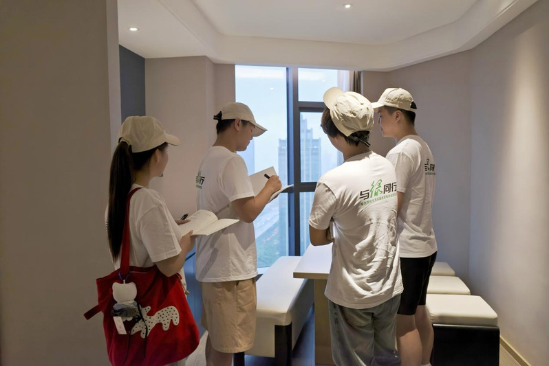 住宿服务的碳排调研同样充满细节。在全季酒店客房内,骨干成员覃博雅、李佳怡用检测仪记录着空调运行能耗:“当空调温度设定为26℃时,每小时耗电量比24℃低0.8度,若酒店所有客房统一调整,每月可减少近千度电耗。”团队发现,传统酒店普遍使用的化纤布草,清洗时需消耗更多水资源与洗涤剂,而部分酒店试点的生态棉麻布草,不仅亲肤性更佳,清洗频率还能降低1/3。此外,志愿者们还统计了客房内一次性用品的使用量,发现配备可替换装洗护用品的酒店,单房日均垃圾量减少约150克,这些数据是后续制定降碳措施的重要依据。