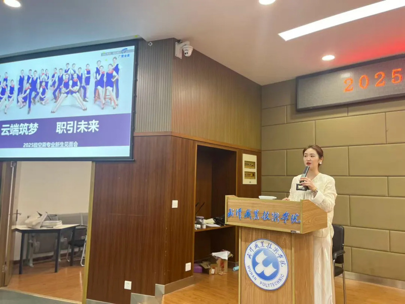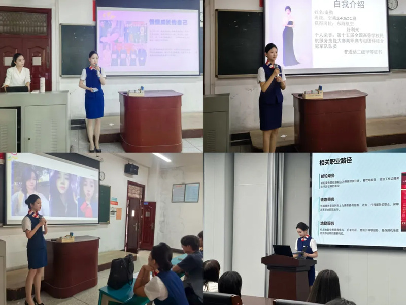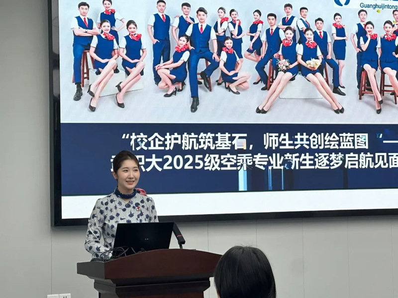 广慧金通驻校工作处主任张楠楠以“云端筑梦 职引未来”为主题,从行业趋势、岗位通道、个人规划三维度,为新生梳理“空勤—地勤—高铁邮轮—企事业单位”多元路径,并发布“金通蓝天成长计划”:三年英语提升、职业形象塑造、100%企业导师覆盖、优先推荐高质量就业。