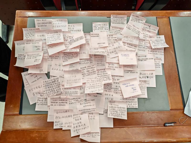 晚自习的互动环节,教室里的氛围变得格外活跃。在“拾光信笺”活动中,同学们接过五彩的便利贴,低头认真写下自己的感悟与心愿。“我希望在大学期间不断提升自己,争取早日向党组织靠拢。”一行行真诚的文字,流露出新生们对未来的期待和对信仰最初的向往。写完后,大家依次将纸条贴在教室后方的展板上,慢慢汇聚成一面承载着初心与梦想的“心声墙”。