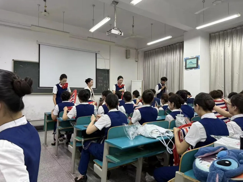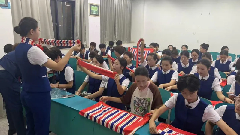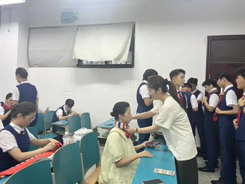 活动中,2024级空乘专业的学长学姐们走进各班,以班级为单位为新生们现场教学如何系丝巾、打领带。他们不仅细致讲解步骤,还亲自示范,展现了空乘学子良好的职业风貌和专业素养。新生们在学长学姐的带领下认真学习,积极互动,现场气氛温馨而热烈。